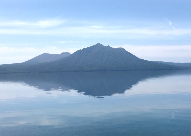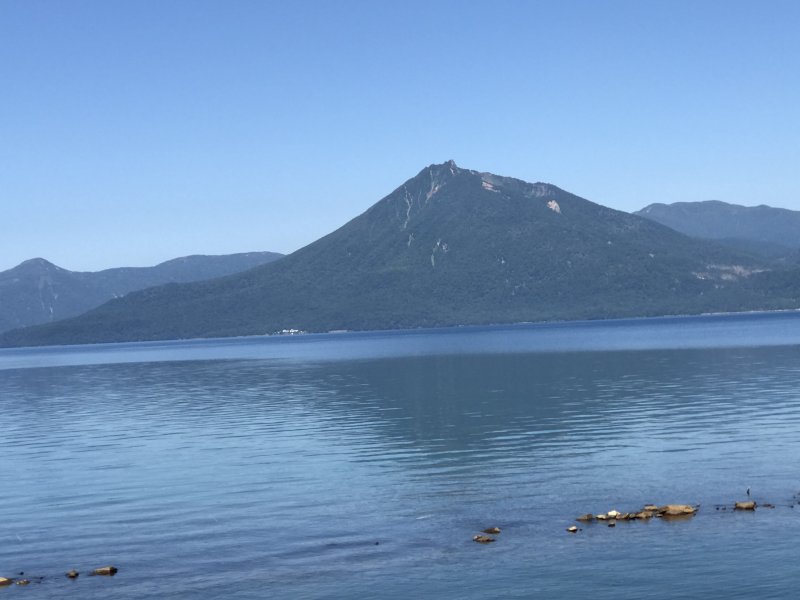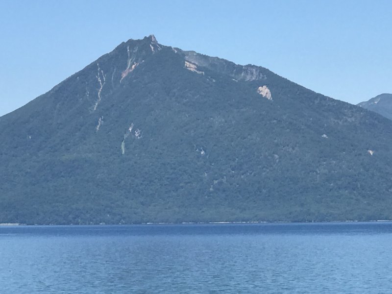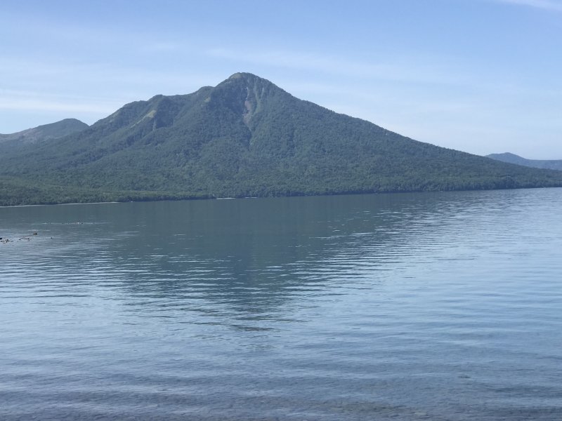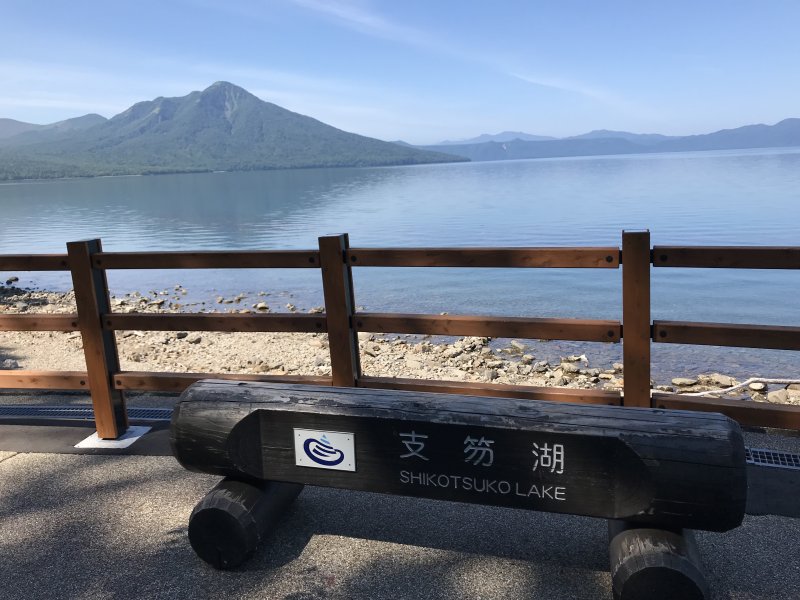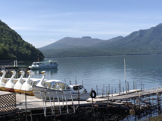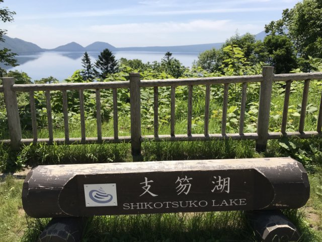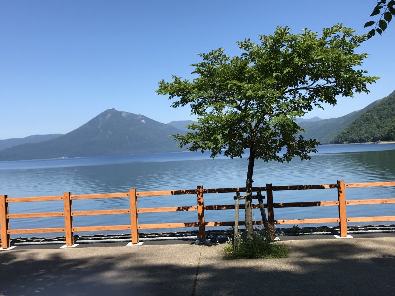 支笏湖ブルーと呼ばれる美しい湖。支笏湖は火山活動で4万年以上前に作られたカルデラに水が溜まってできたカルデラ湖。標高248m、周囲40km、最大深度360m、平均水深265mで透明度が高いため、支笏湖ブルーと呼ばれる深い