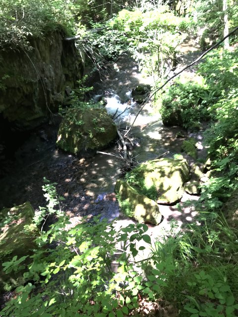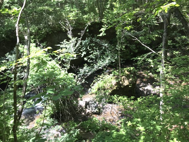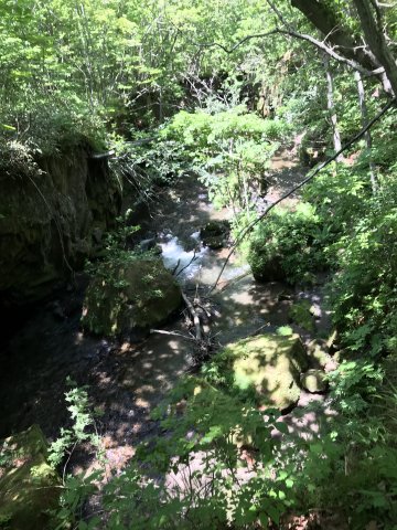流れています。樽前川沿いは高さ5-6mの渓谷で新緑とコケに覆われた崖や岩が美しい。川沿いには散策路があります。川周辺の崖・岩の崩落の危険性があるため、現在はロープが張られ、下の川には降りられません。また、一帯は深い森林で