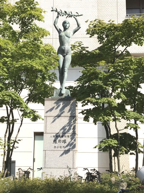 ・1973年に苫小牧市が「人間環境都市宣言」をした記念碑のオリーブを両手に掲げた女性像。苫小牧をグルリと緑の輪で囲む意味でつくったという。