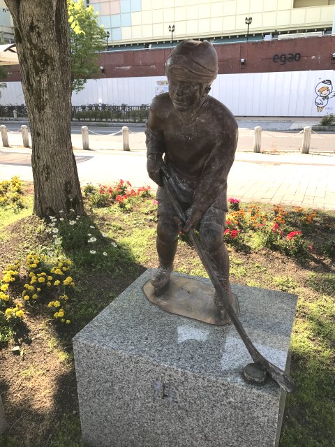 ・苫小牧はアイスホッケーが盛んな町で、レッドイーグルス北海道の本拠地は苫小牧。前身は王子製紙。駅前にはその像が建っている。