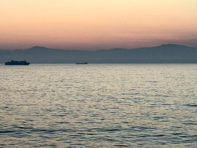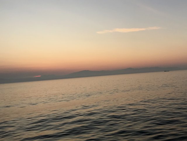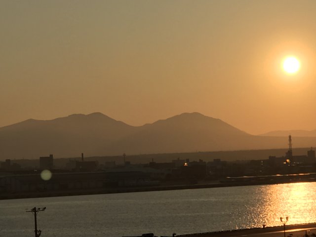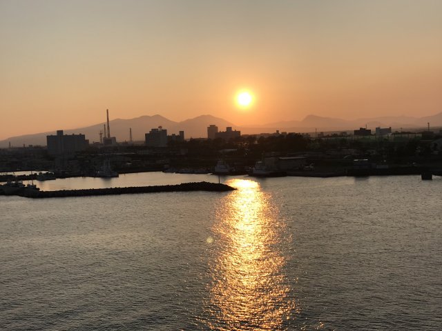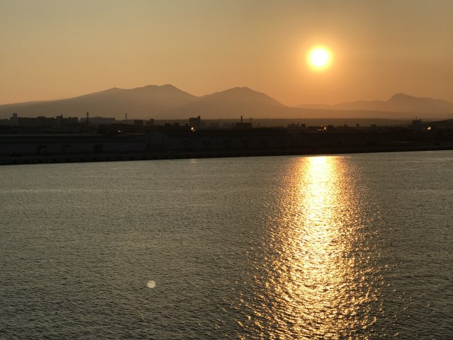 苫小牧港のカーフェリーから夕日に照らされた「樽前山」を眺めていると、旅も終わりに近づいていると感じた。