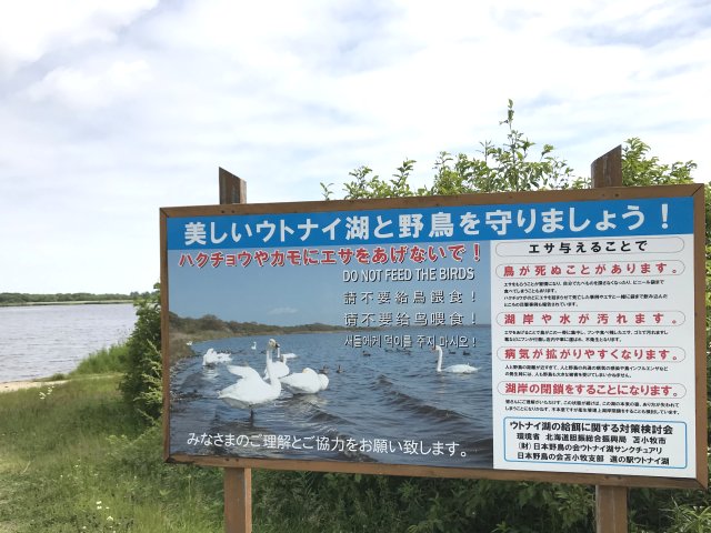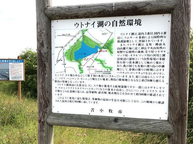 1982年に国指定鳥獣保護区に定められ、1991年国内4番目のラムサール条約の登録湿地で、ウトナイ湖は周囲9km、面積275ha、平均水深0.6mの淡水湖。語源はアイヌ語の「ウツ・ナイ・ト」であばら骨の川の沼の意味。