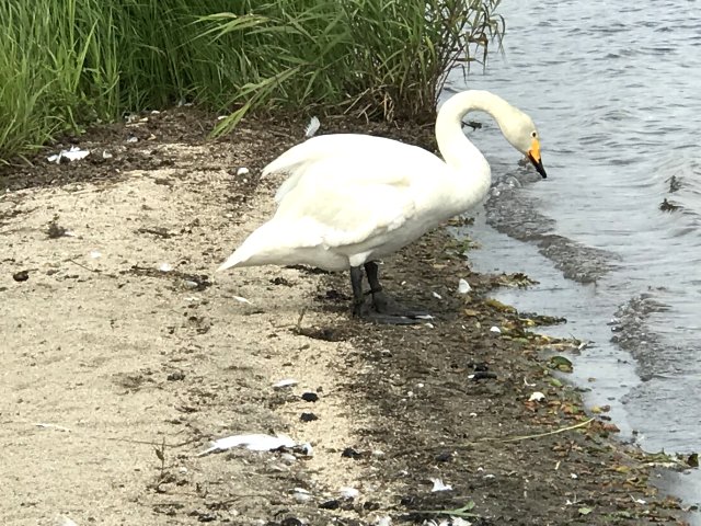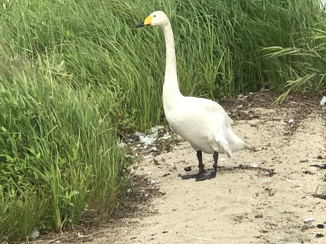 展望台からはウトナイ湖を一望でき、屋上デッキからは360度見渡すことができます。コハクチョウは夏にシベリアで繁殖、冬(10/上)に南下して日本に飛来してきますので、夏場にいるのは珍しい。