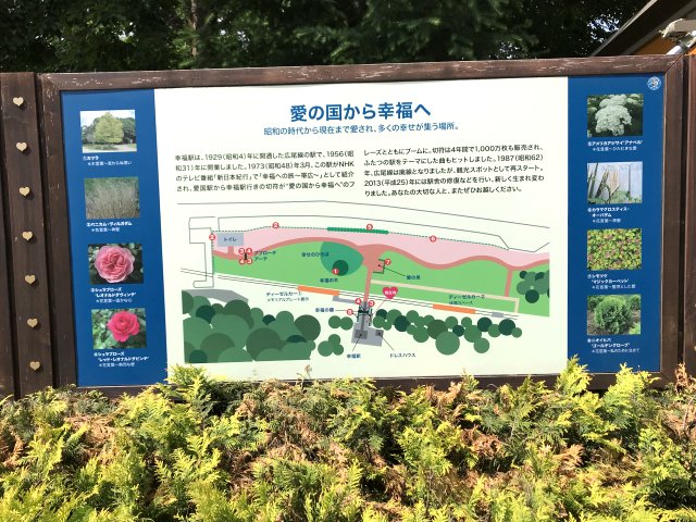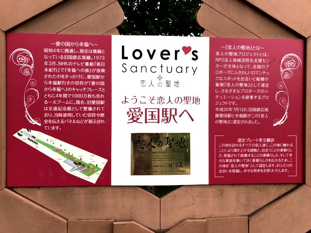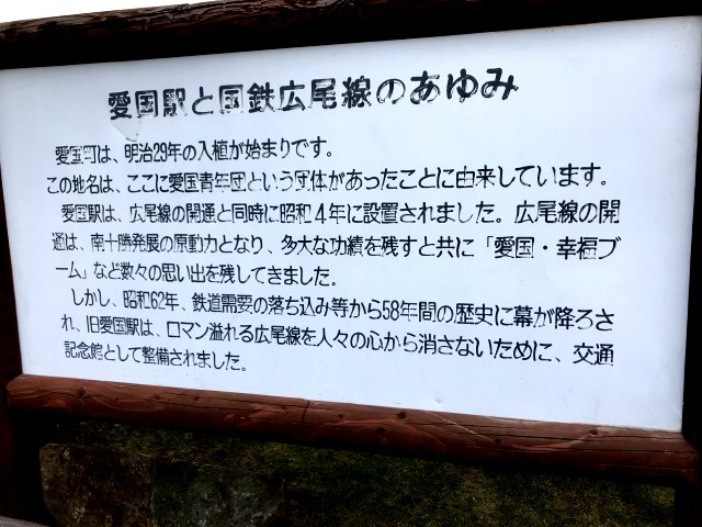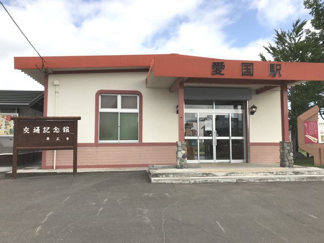 1929年開業、1987年廃線。現在は「交通記念館」として当時の切符や写真パネルを展示。駅舎前には「愛国から幸福ゆき」の乗車券をモチーフにした石碑、販売1000万枚記念碑が設置。
