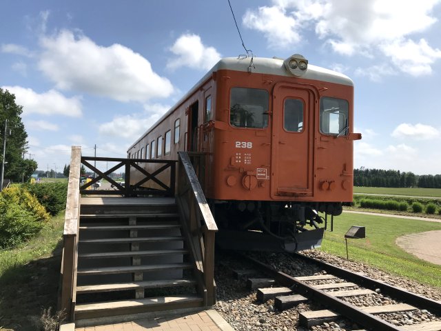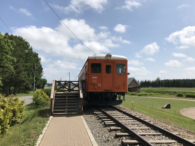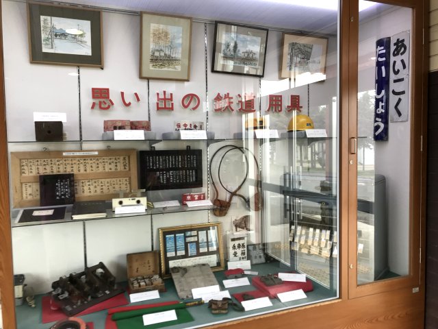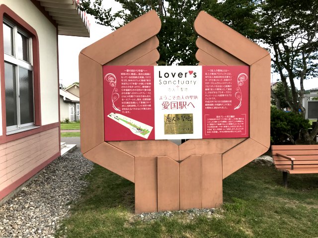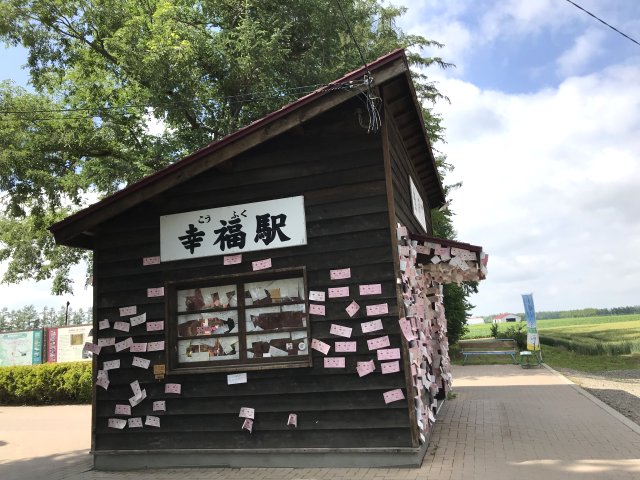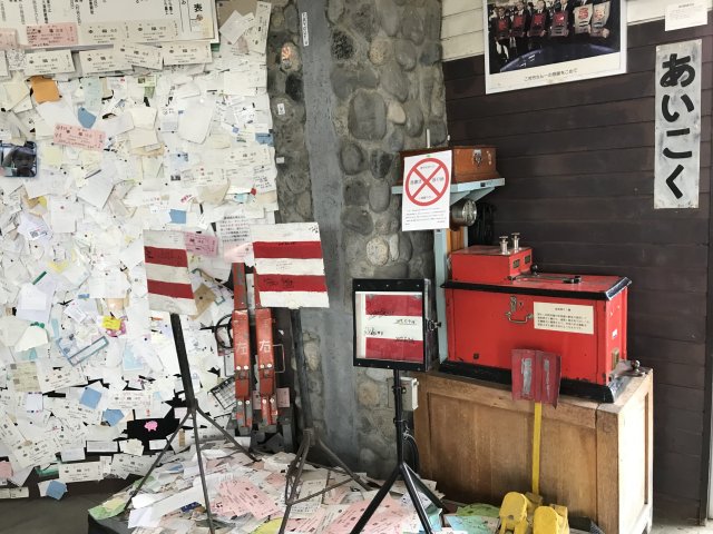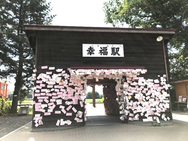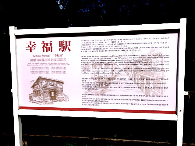 2両のディーゼルカー、除雪車1両を保存・展示。昔懐かしい木造の駅舎跡で待合室として利用されいた。駅舎の中や壁には幸福を願うメッセージがいっぱい貼り付けてあり、ピンク色に染まっています。このピンクのキップは幸せを願う観光客が