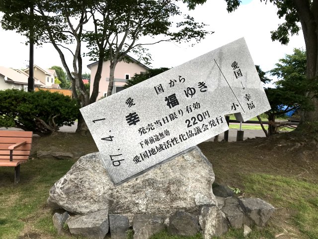 また「愛国から幸福ゆき」切符は4年間で1000万枚も売れたという。幸福駅前の売店で日付入りのキップキーホルダーを購入しました。この日は7月7日の「七夕」。旧広尾線は帯広-広尾間(84km)を運行、駅は北愛国-愛国-大正-幸福-中札内の順番。