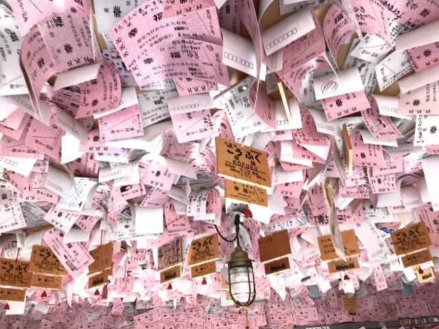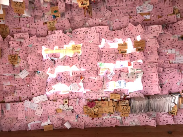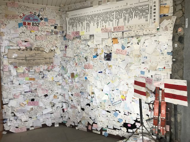 自分の名刺を貼って帰ったことがきっかけと云われ、大きなピンクの切符に願い事を書いて、駅舎の壁に貼り付けています。ピンク色の大きな切符(\180)は幸福駅の売店で購入できます。