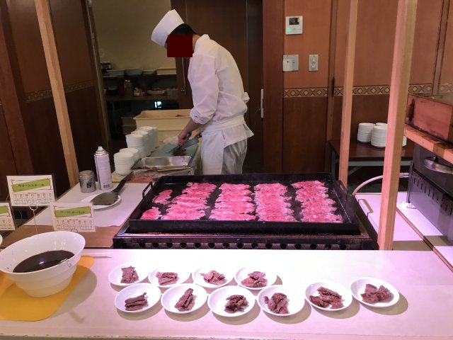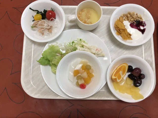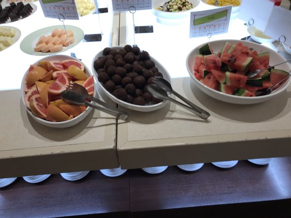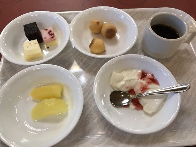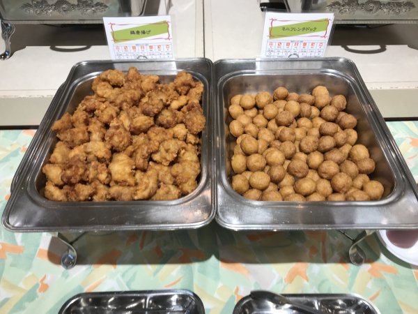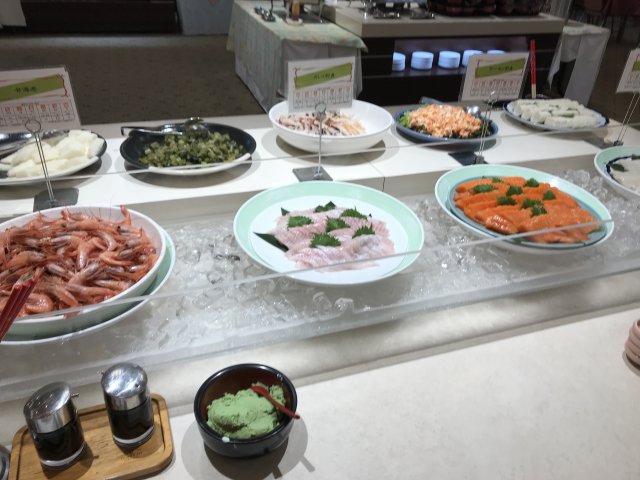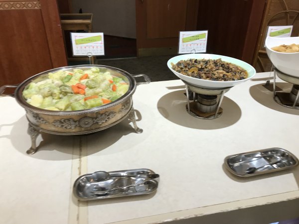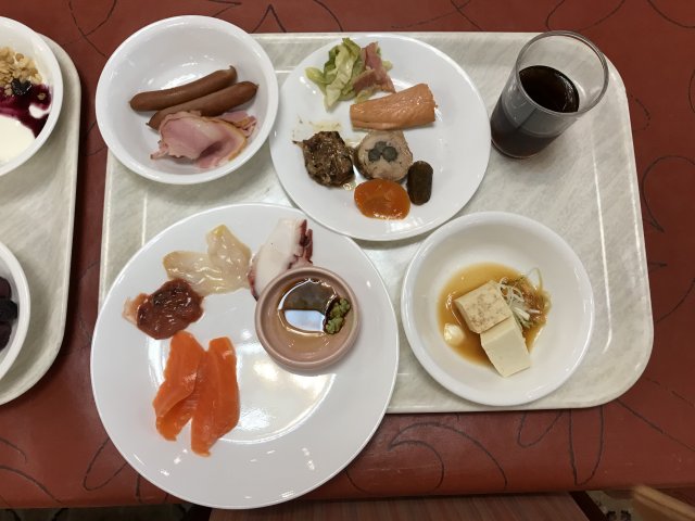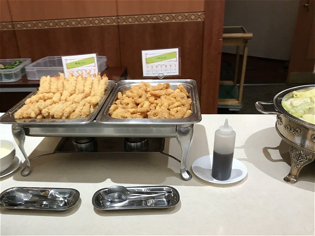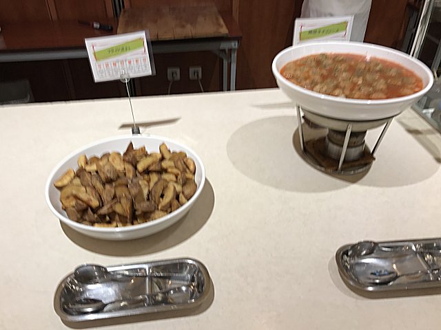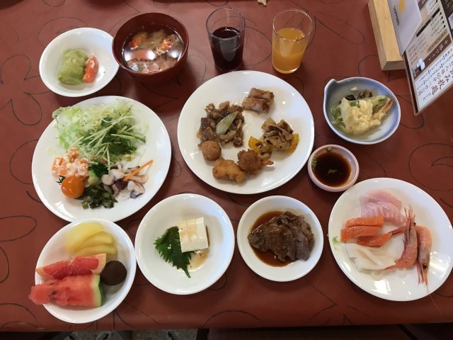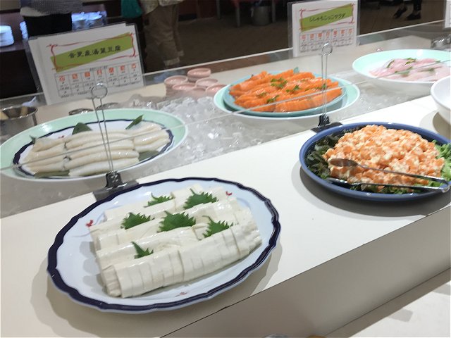 ・夕食はバイキング(和・洋・中)。品数もたくさんあってまずまず。ステーキは柔らかくておいしかった。刺身の種類が少なかった。今回の旅では各地でお刺身や海鮮料理をたくさん食べたのでよしとするか。