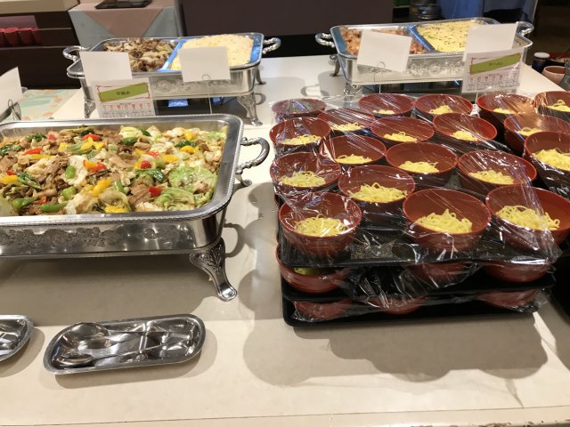 食事は1Fのコンベンションホール。夕食は18:00-21:00,朝食は7:00-9:00。アルコール消毒設置。マスク着用、使い捨て手袋着用。