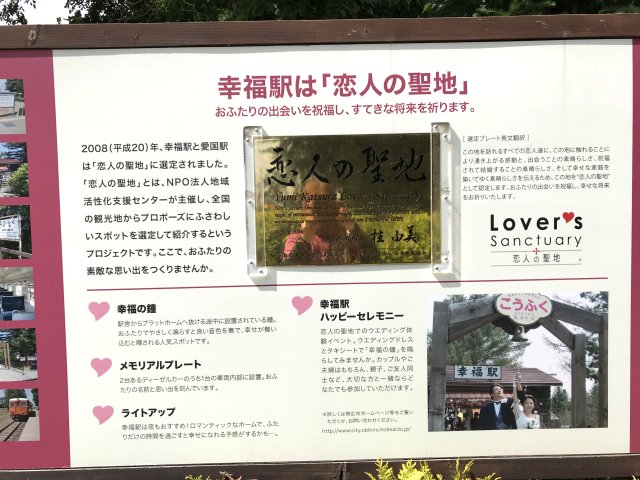 幸福駅は今でも人気のパワースポット?。恋人の聖地として知られ、年間10万人が訪れるという。この日は平日だというのに何組かの若いカップルが訪れていた。駅舎や板張のプラットフォーム、レール上にはキハ22形キハ22 221、キハ22 238の