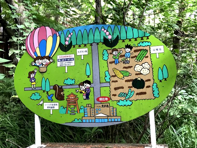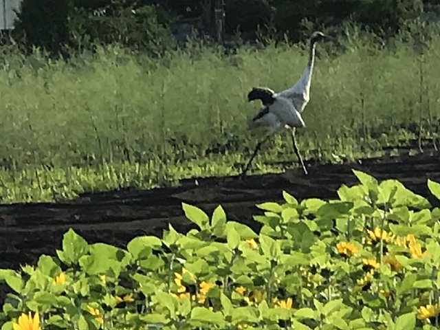 ホテル前に庭園あり。奥には自家菜園があり。ホテル周辺は自然豊かでシマリスや野鳥などがいました。何と畑にはタンチョウがやってきていました。