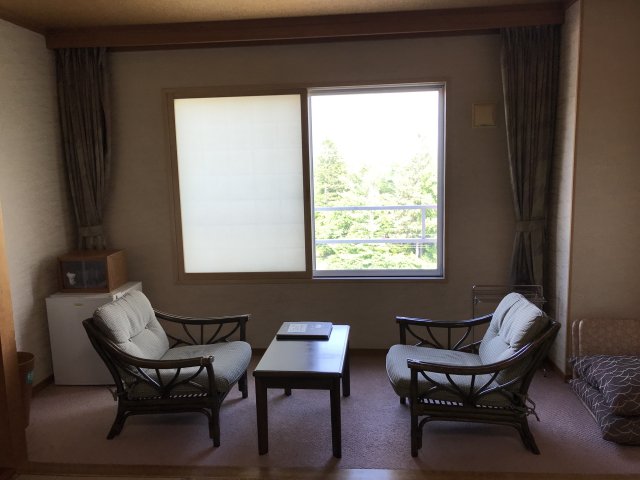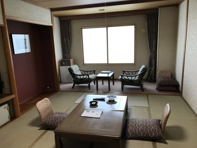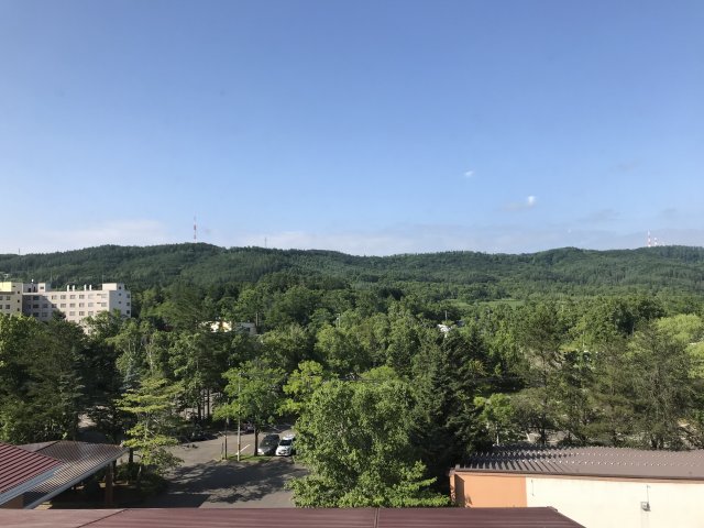 部屋は懐かしさのある温泉宿の和室。部屋を改装中らしいけど、老舗旅館の部屋は 古びた感じが否めない。6Fの角部屋で見晴らしは良かった。眼下には十勝川河川敷近くの森、反対側には温泉街のホテルが見えます。