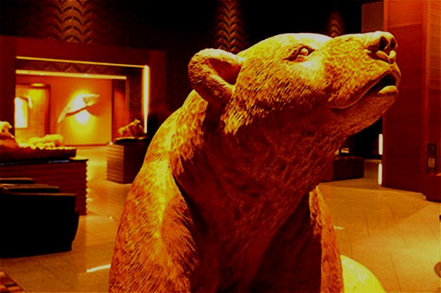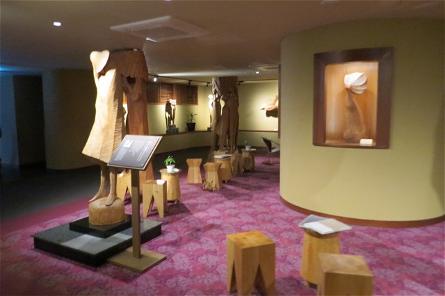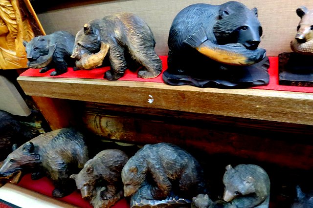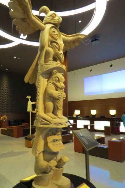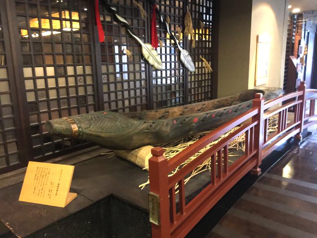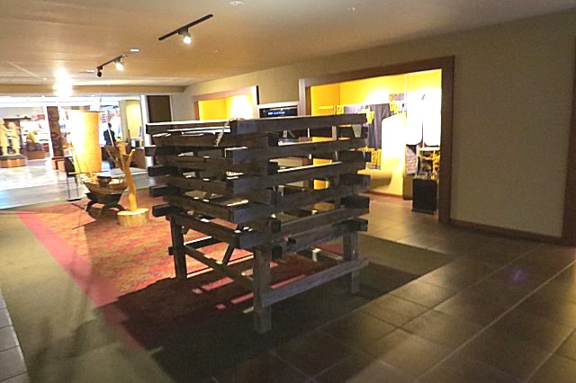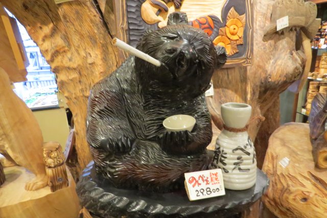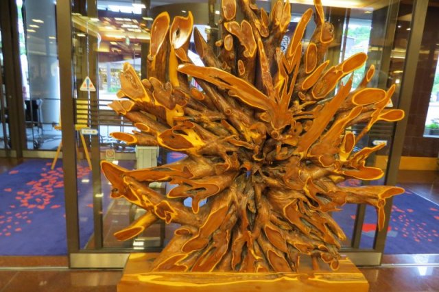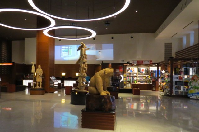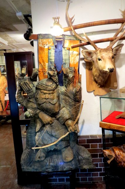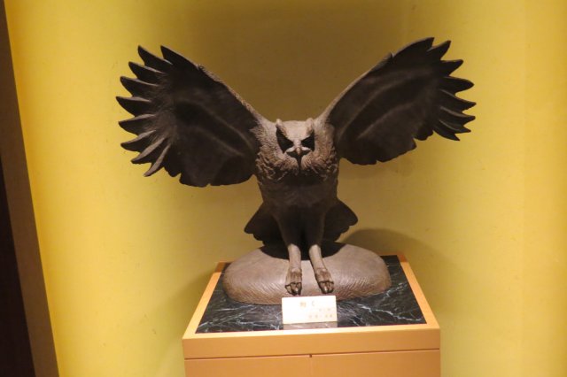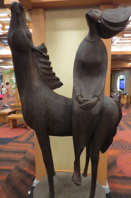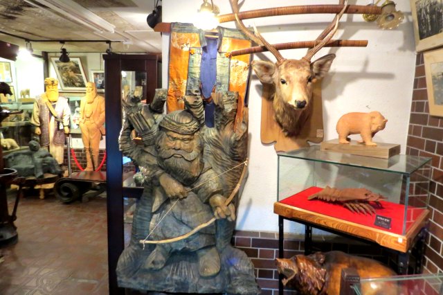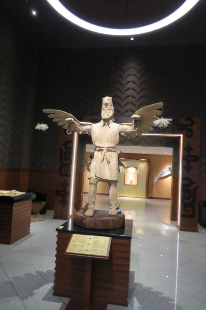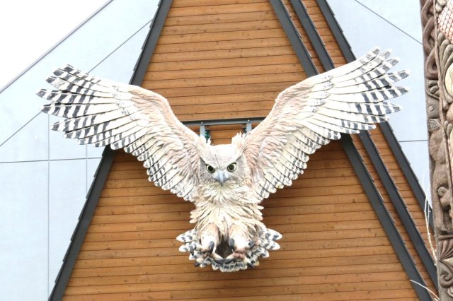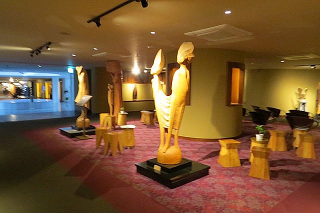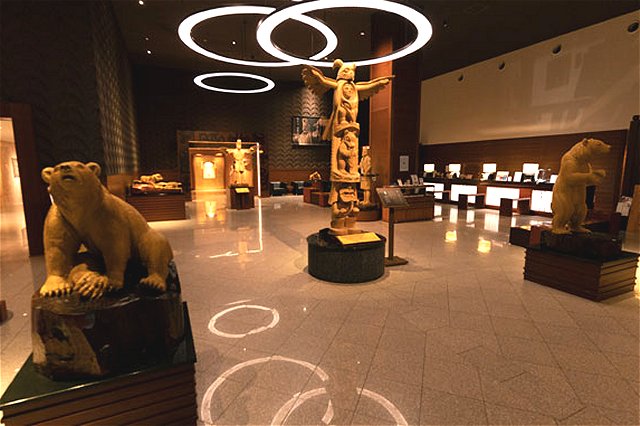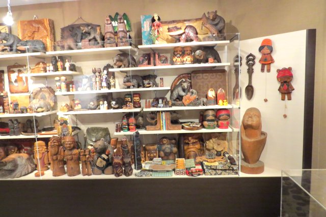 ・この先には翼をつけた壮大なカムイニ(3m)や大きなクマなどの彫刻が並び、アイヌ文化の香りが漂っています。ウイングスロビーには木彫り作家・藤戸竹喜氏の常設ギャラリーで、熊の彫刻は1本の木から掘って削ってあり、そこに