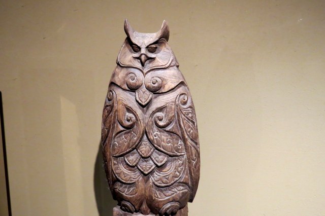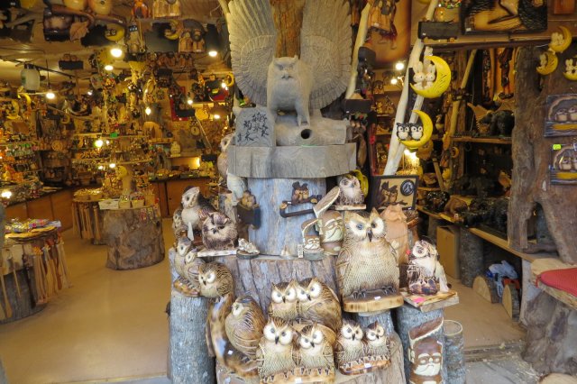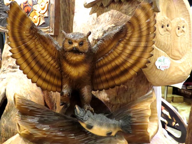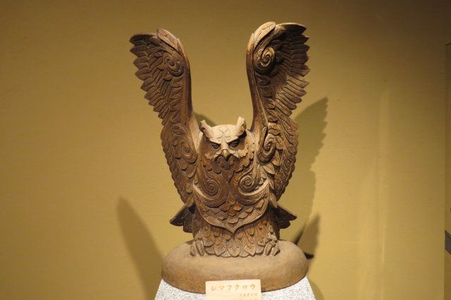 ・鶴雅の魅力のひとつはアートギャラリー。阿寒やアイヌの文化、ふくろうやクマなどの木彫りの伝統工芸品など多数展示。あかん遊久の里鶴雅とあかん湖鶴雅ウイングスとは通路で繋がり、まさに美術館のようなギャラリーロード。