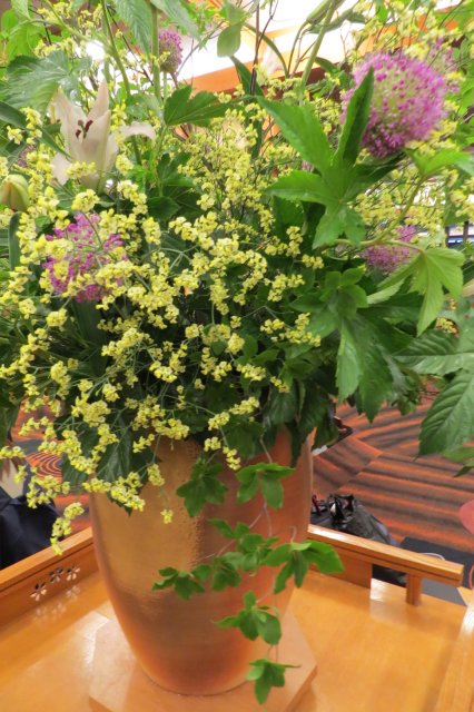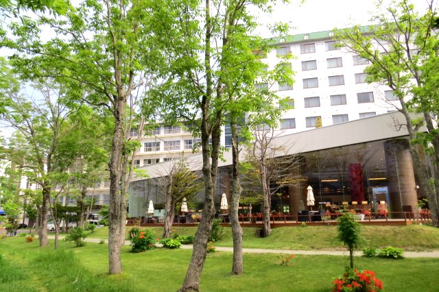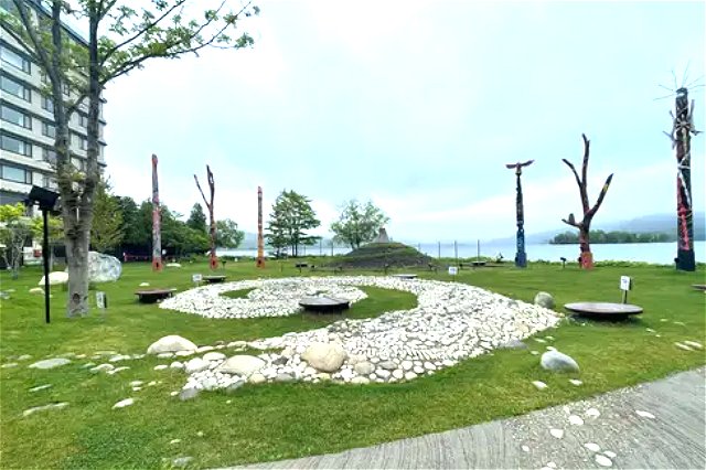 ・2018年に鶴雅ウイングスの中庭には「阿寒 イオマプの庭」がopen。アイヌの文様のカムイニー(トーテムポール)が建ち、草花が咲き誇るこんもりとした山のドレスガーデン、アイヌ文様のカムイ・ニーが印象的な白い石が並んでいます。