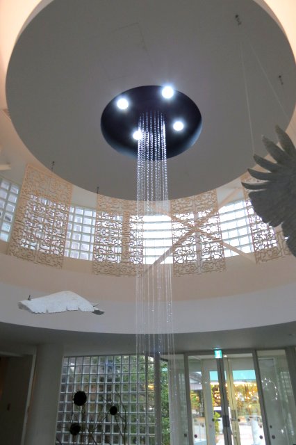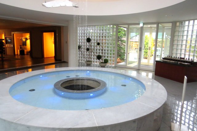 ニタイと呼ばれるアイヌ語の「森」では彫刻家の瀧口政満氏の木彫作品で、森の精霊が木の彫刻に宿っているかのよう。中間部の白い「テックプ」はアイヌ文様で装飾された天井からパールのような水が降りそそぎます。ここから
