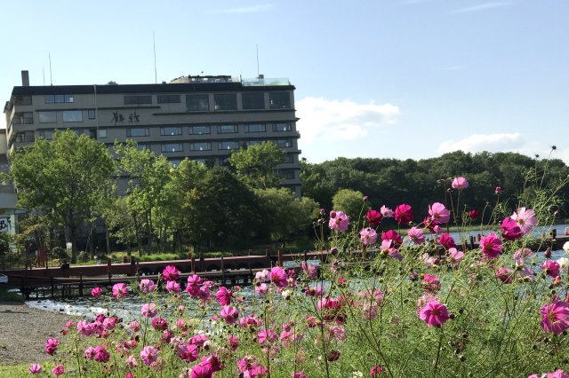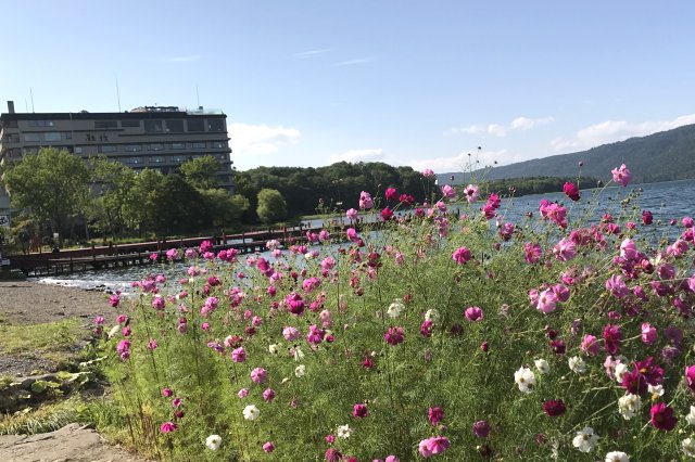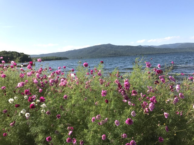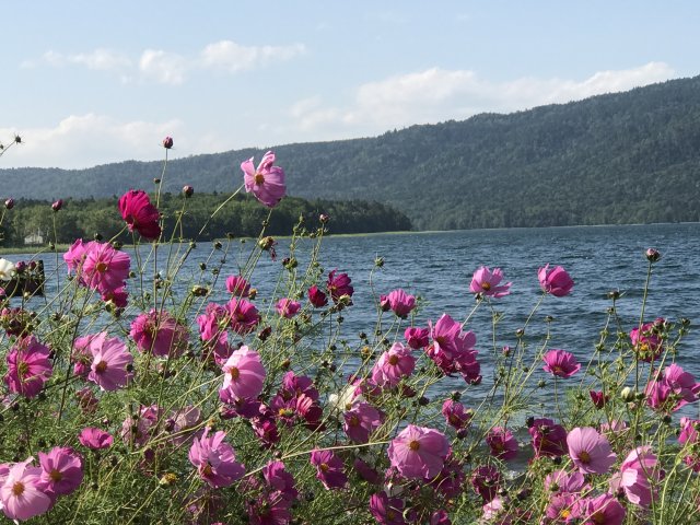 澄んだ青空のもと、阿寒湖の湖畔に咲くコスモスの花が風に揺れていました。「阿寒湖温泉・鶴雅」と「国設阿寒湖畔スキー場」を訪れた。