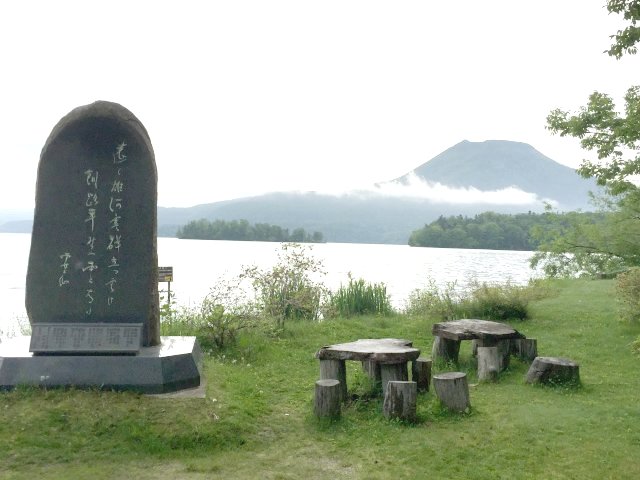 ・雄阿寒岳を背に、湖畔の庭園には野口雨情の石碑が建っています。
