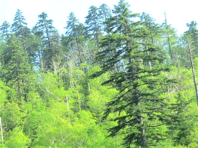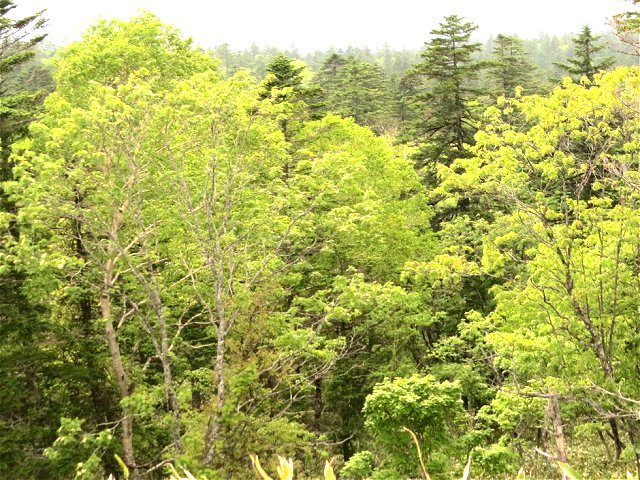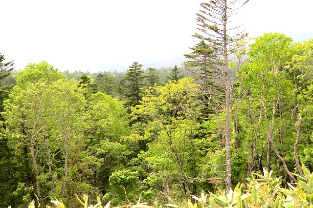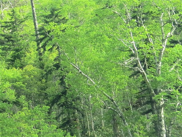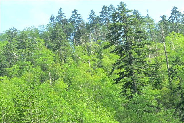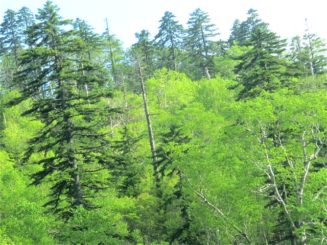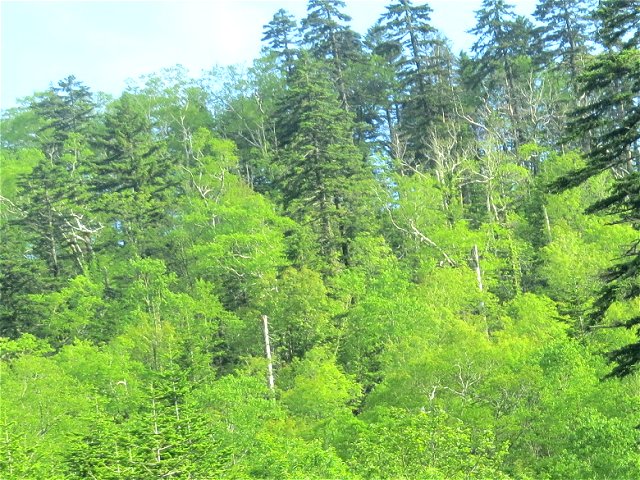 ■阿寒の森はトドマツやカエゾマツ、ミズナラ、カツラ、シラカバなどの針葉樹や広葉樹が入り混じって、美しい新緑の風景が広がっていました。