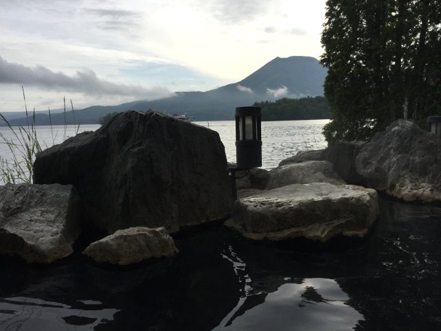 ・湖面と同じ高さのお風呂で雄阿寒岳と阿寒湖が望めました。阿寒湖にはちょうど観光船が運行していました。