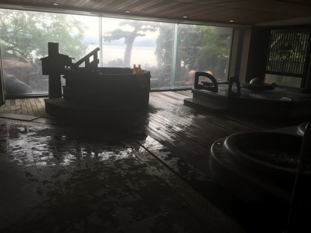 ・展望風呂(内風呂)は全面ガラス張りで阿寒湖が一望できました。歩行湯は湯と水を交互に歩いて、床の石が足ツボを刺激しました。岩盤浴はよかった。