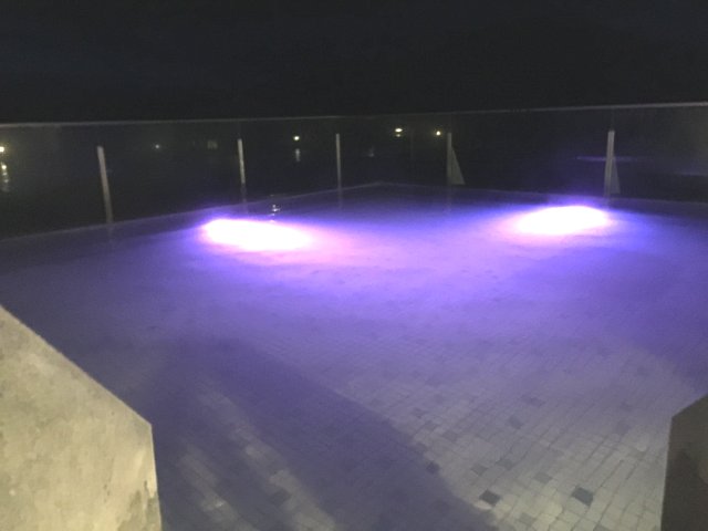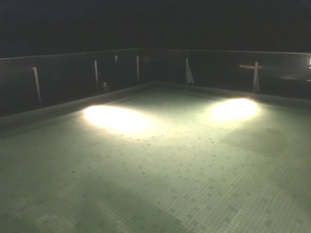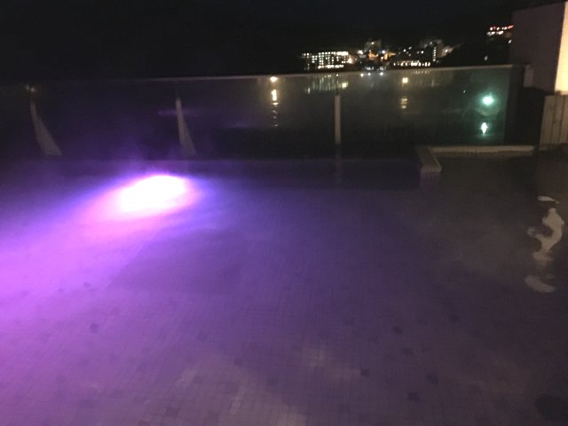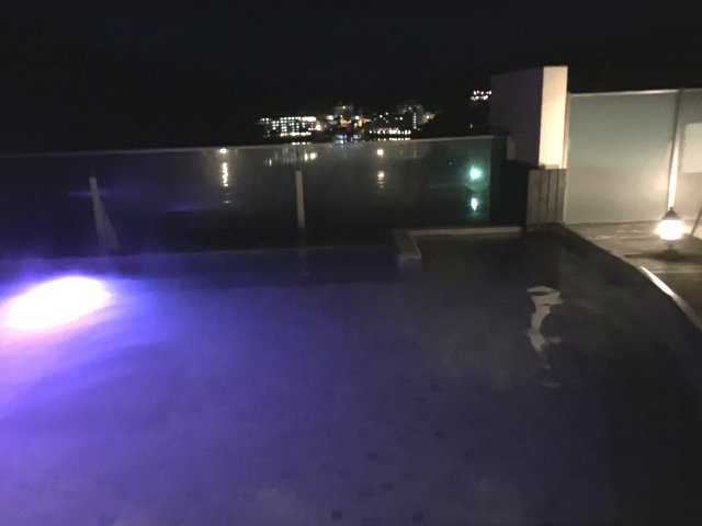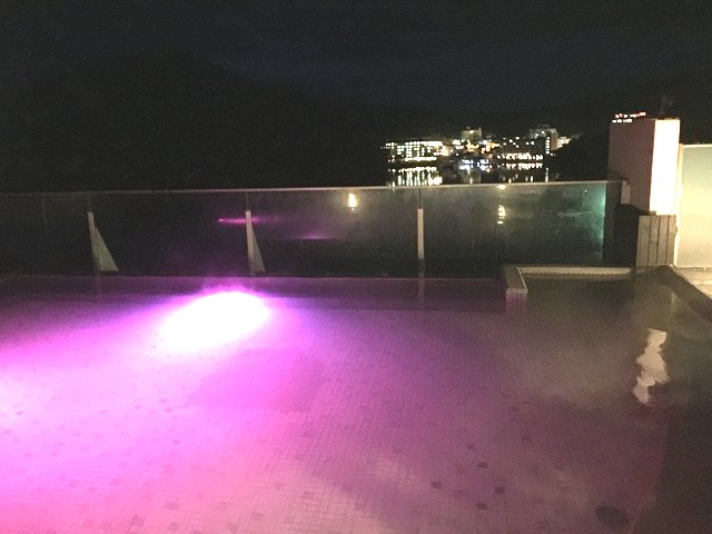 ・屋上は見晴らしのよい露天風呂。夜は阿寒湖温泉街の明かりが灯っていました。真っ暗な空には星が見え、お風呂をブルーにライトアップして幻想的でした。