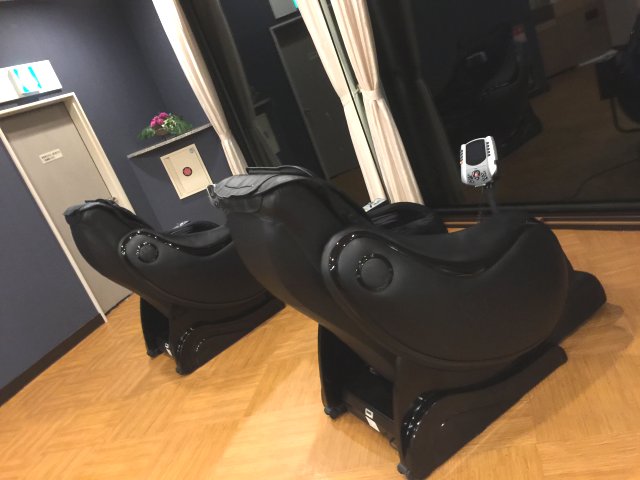 ・大浴場入口にはガラス前にマッサージチェアが置いてあり、ここからも眺めがよさそう。夜は真っ暗でしたけど。