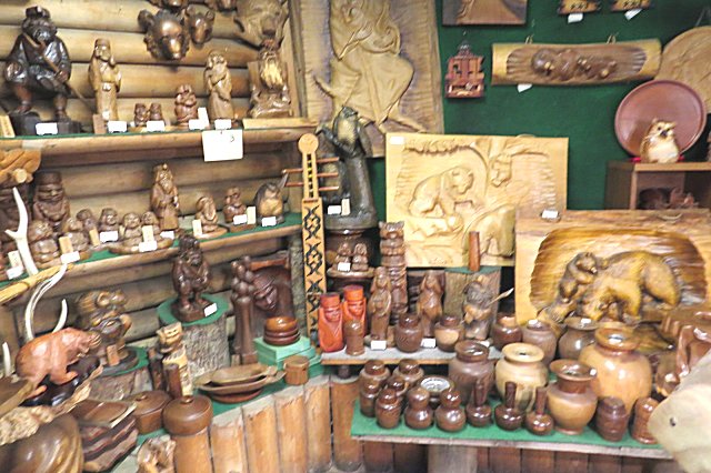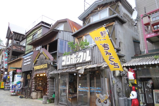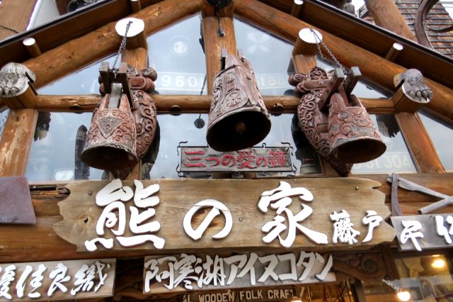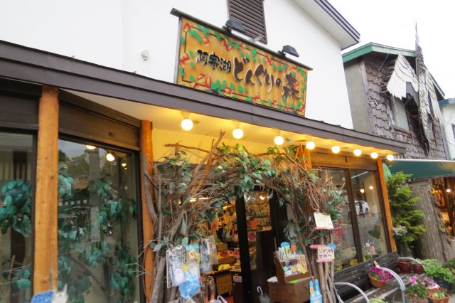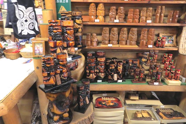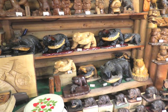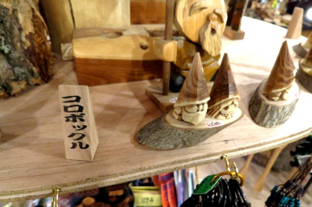湖畔にはアイヌコタンがあり、敷地内には民芸品店が軒を連ね、アイヌ文様のグッズ、動物や鳥などの小物やアクセサリーなど展示・販売。「コタン」はアイヌ語で「集落」の意味。熟練の職人が彫った木彫りやアイヌ文様の刺繍などの伝統工芸店が