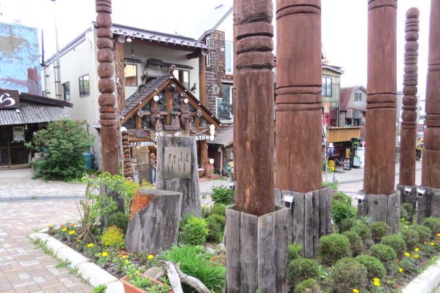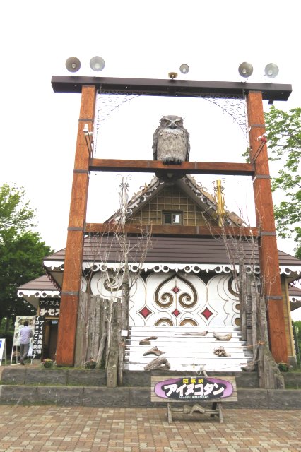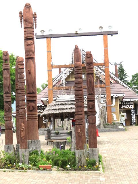 ・アイヌコタンで一番目を引く、カムイミンタラ。カムイミンタラとはアイヌの言葉で「神々の遊ぶ庭」という意味。2007年にカナダ杉を使いコタンの人によって製作されたという。