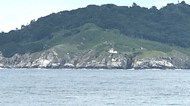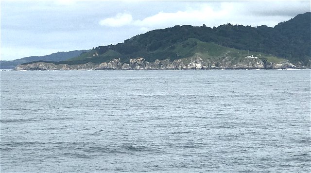 船上から牡鹿半島の先端に、山のような島が太平洋に浮かんで見えます。