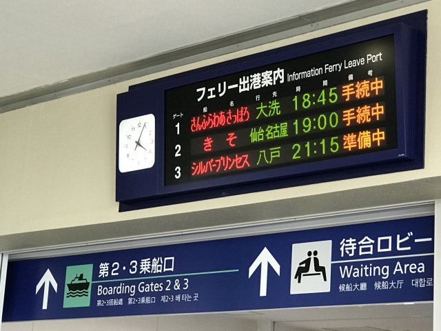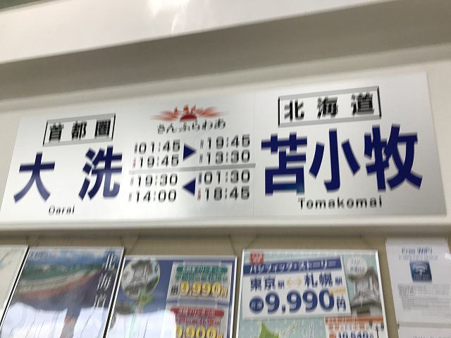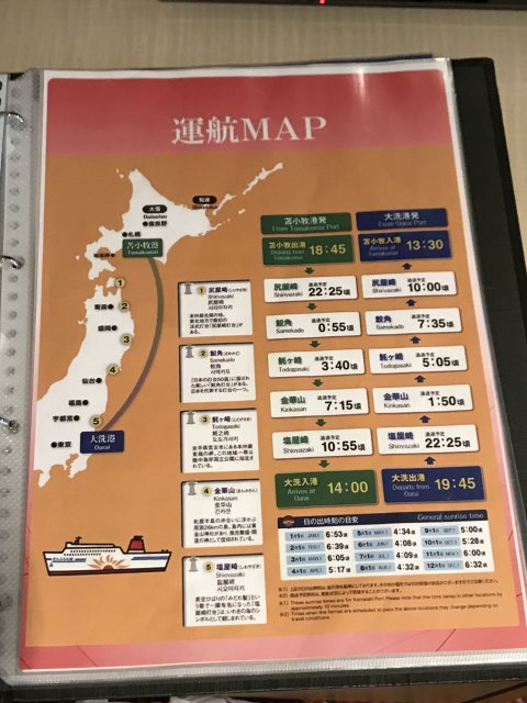 ・往路;<所要時間;17時間45分>大洗(19:45発)-苫小牧(翌日13:30着)