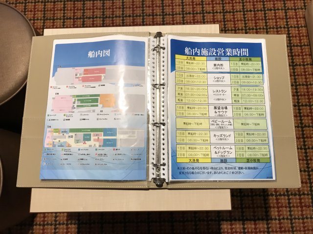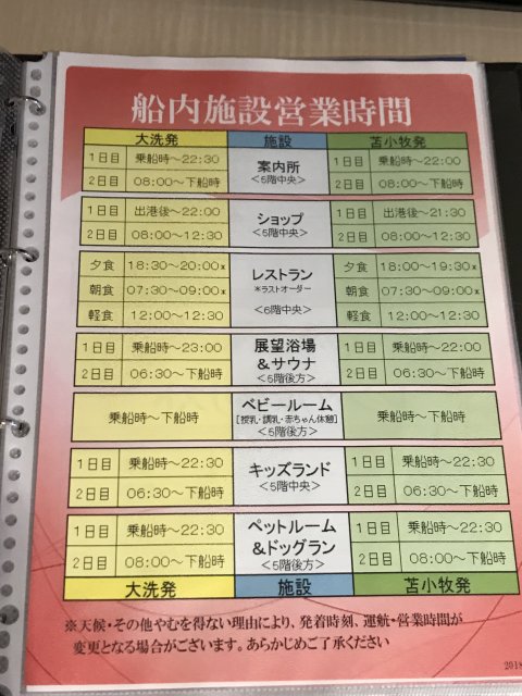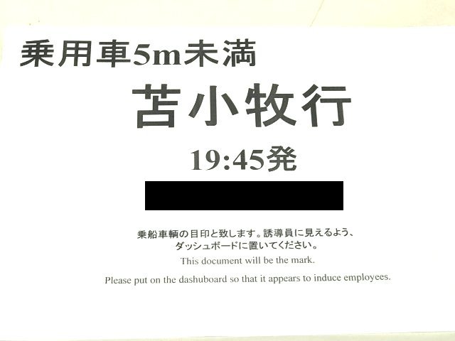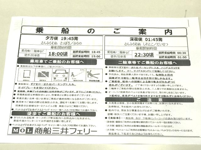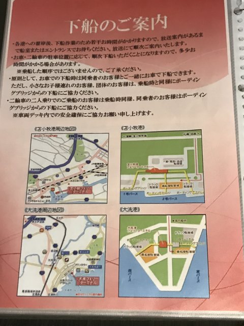 ・乗船案内でドライバーのみ船内に車で移動し、指定位置に駐車する。乗船時の電話・カメラ・ビデオ撮影は禁止。大洗発は17:30頃、苫小牧発は16:30頃乗船。