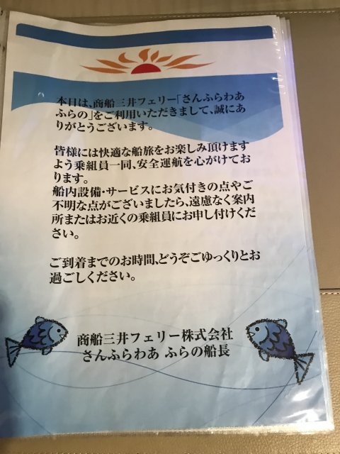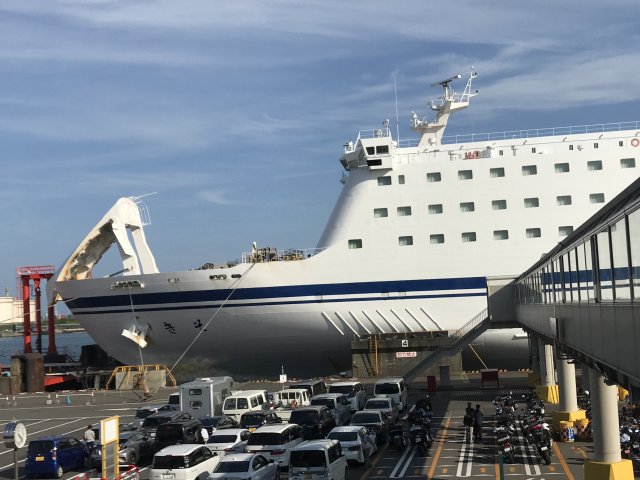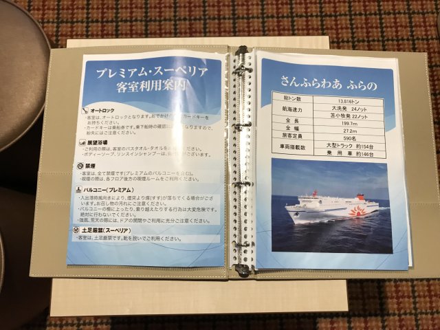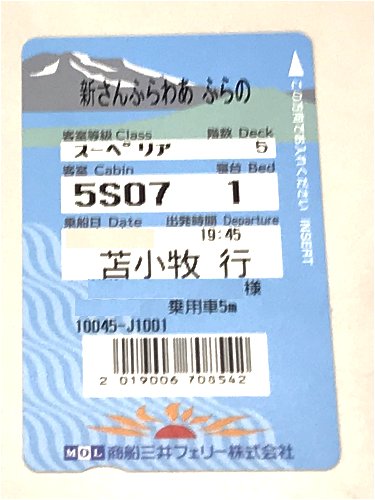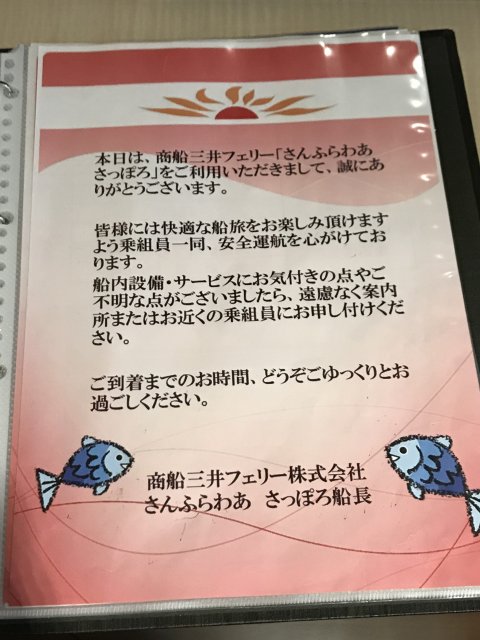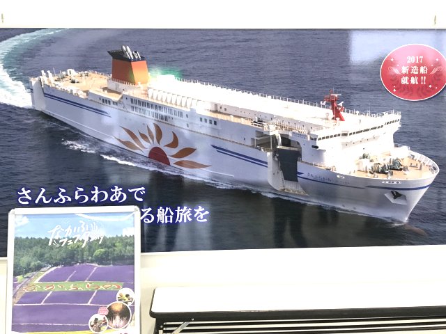 →金銭的には殆どかわらないため、北海道へは往復ともフェリーを利用。三井フェリーの「さんふらわあ ふらの」で18Hの船旅。