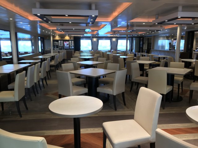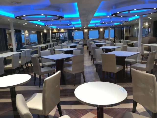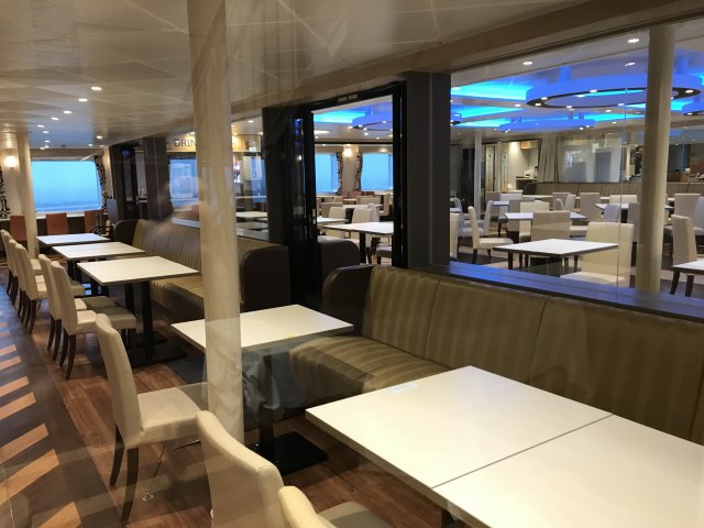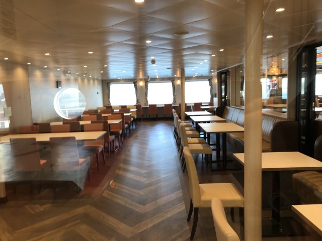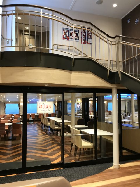 ・レストランは明るく開放感あり。OPEN;大洗発は18:30ー20:30、苫小牧発は18:00ー20:00。