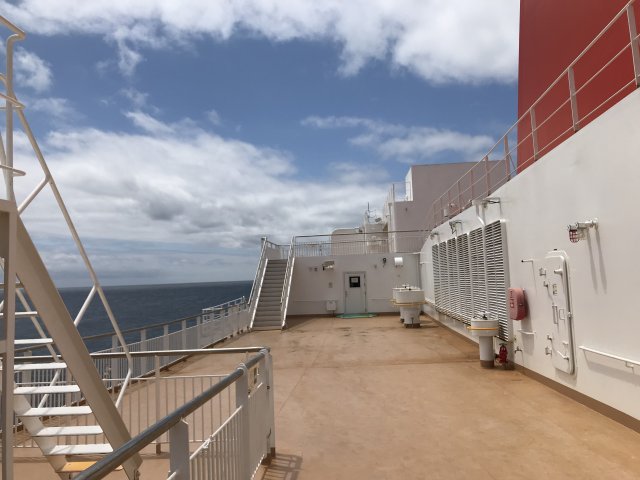 ・航行中でも外の広い後部甲板(5F)に出られます。外は海風が心地よい。6Fにも展望デッキあり。