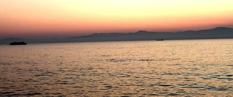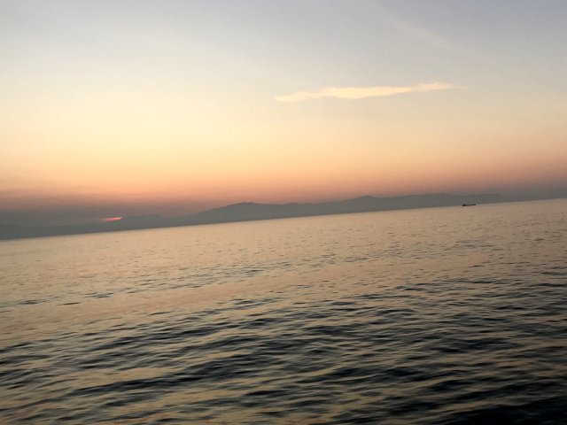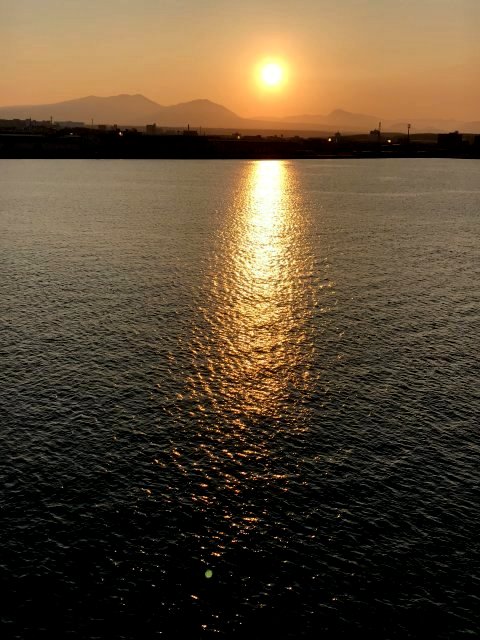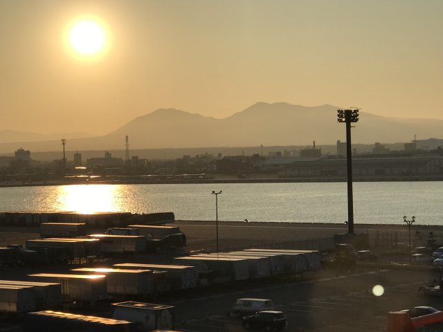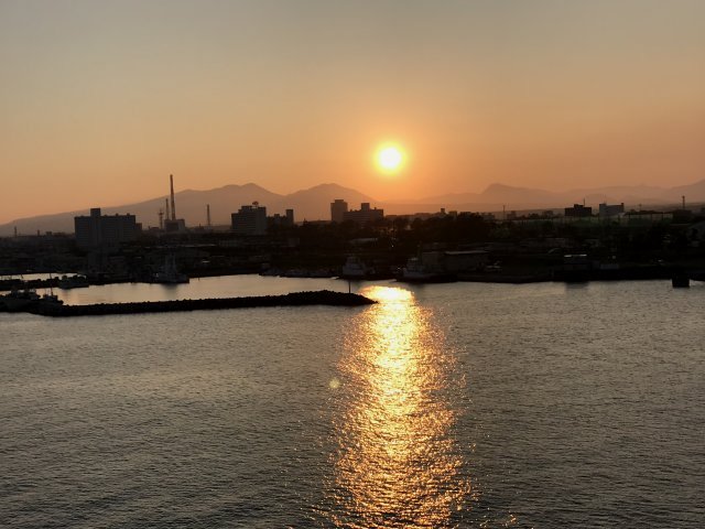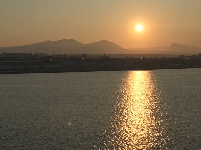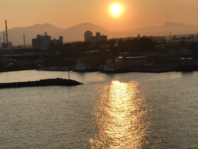 苫小牧西港に沈む夕日がきれいでした。苫小牧の市街地、その奥には樽前山と風不死岳が眺められた。苫小牧港から沖へ。徐々に小さくなる北海道・・・。
