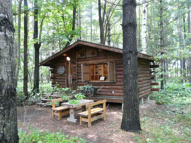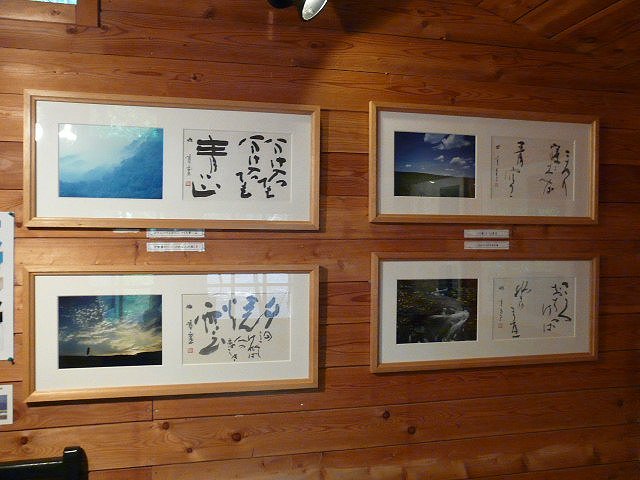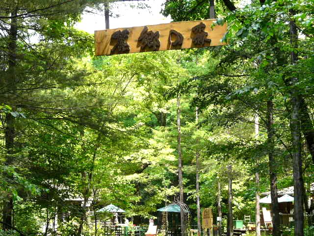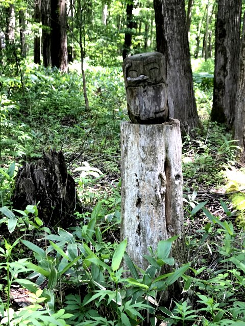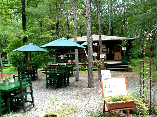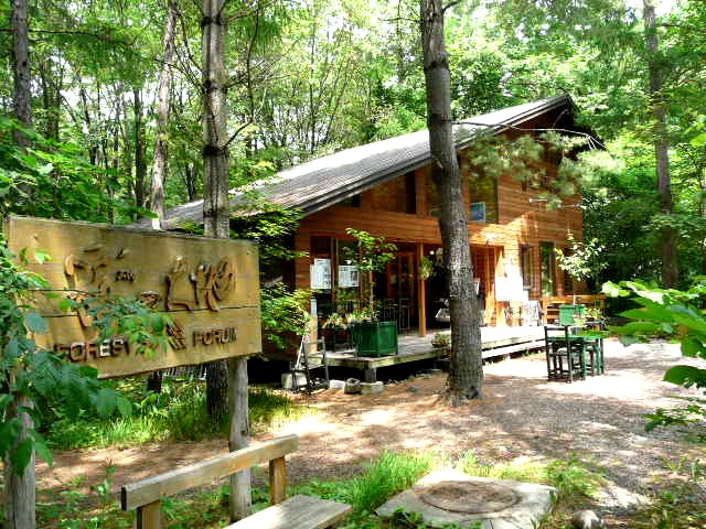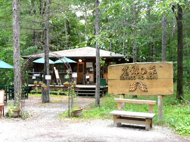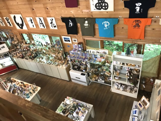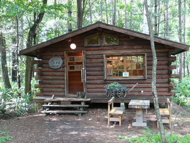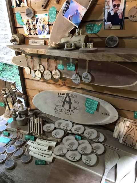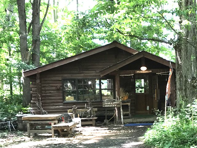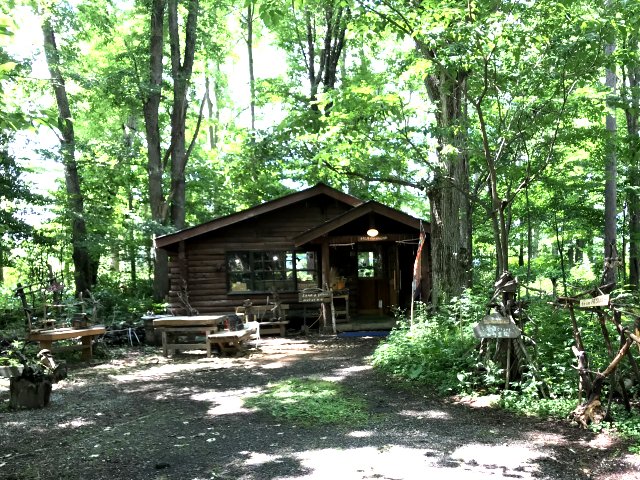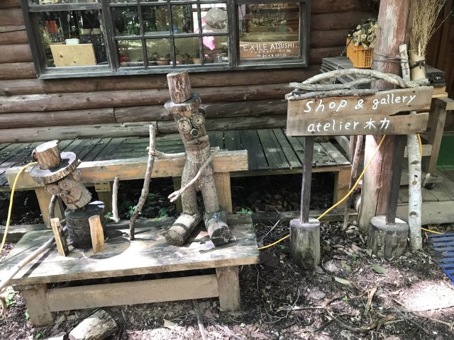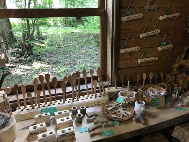 ・森の中にログハウスのお店(「木力工房」)があり、周囲には木のオブジェが置いてあり、森に溶け込んでいます。店内ではオーナが木のオブジェを作っています。木のコースターやプレート、ペンダント、スプーン、置物などいろいろ。