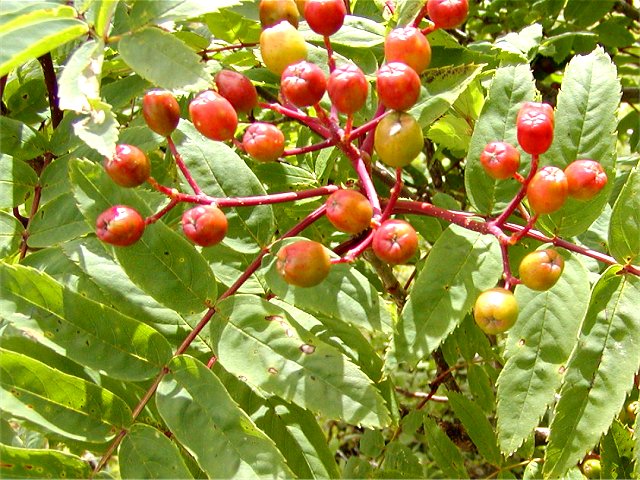 乗鞍高原上部ではナナカマドの実が赤くなりはじめ、ヤマウルシやカエデの葉が一部赤くなりはじめた。乗鞍岳の雪は解け、乗鞍大雪渓には一部残っています。大雪渓の雪は幅100m×長さ40m。この時期でもまだスキーができるとは。