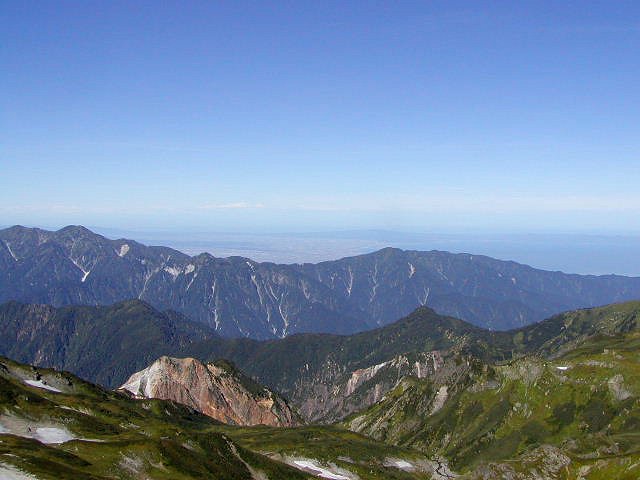 爺ヶ岳からは一番手前に大きな蓮華岳の稜線。中央には餓鬼岳〜唐沢岳。その奥には有明山、燕山荘・燕岳・北燕岳・東沢乗越。
