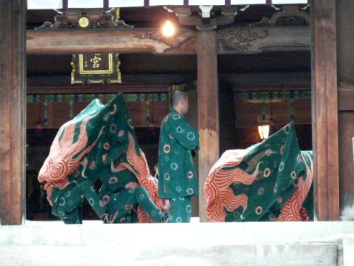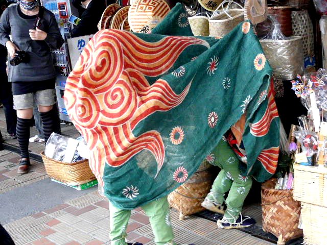 綾渡りを見せた唐子人形が和尚の肩へと移ると観客から大きな拍手が沸き起こった。続いて女唐子人形の綾渡り。同様に5本目の綾渡りを終え、女唐子人形も和尚の右の手の上に着地。和尚が軍配を天に向け高く掲げます。最後は紙ふぶきで