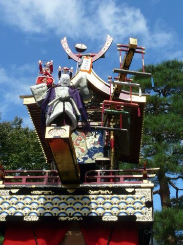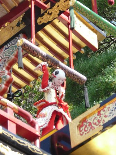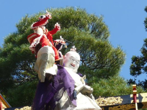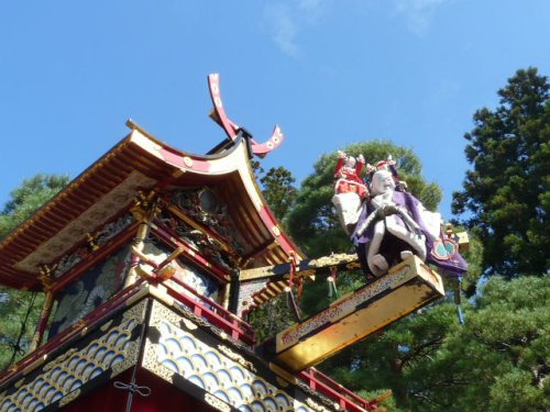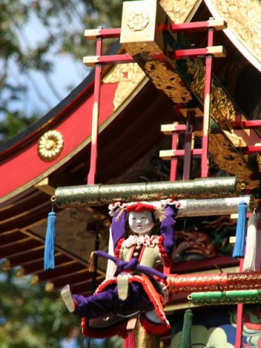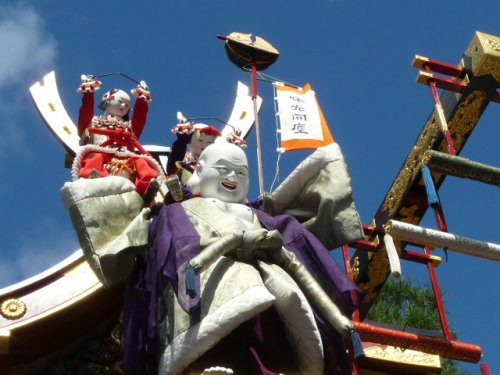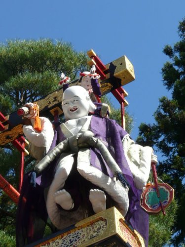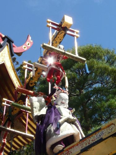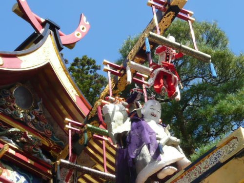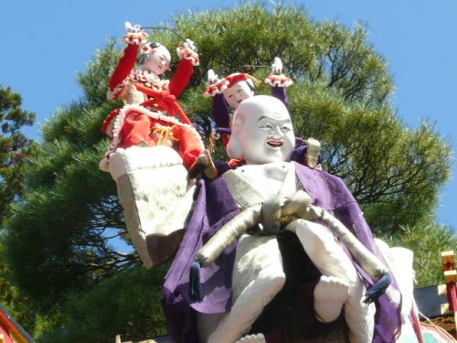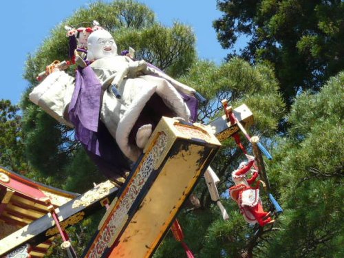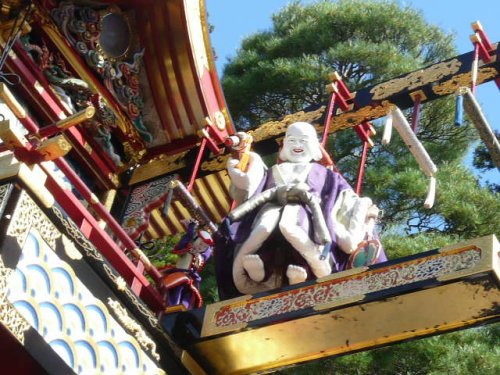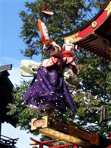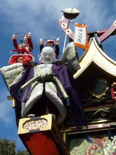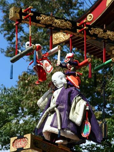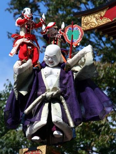 繰り出す屋台と担い手も春とは異なり、秋は唯一のからくり人形「布袋和尚」。布袋和尚は満面の笑顔で白く福々しい顔に心が和み、自然に円満な気持にさせてくれる布袋和尚。からくりの見せどころは宙に並んだ5本の横棒をからくり人形が