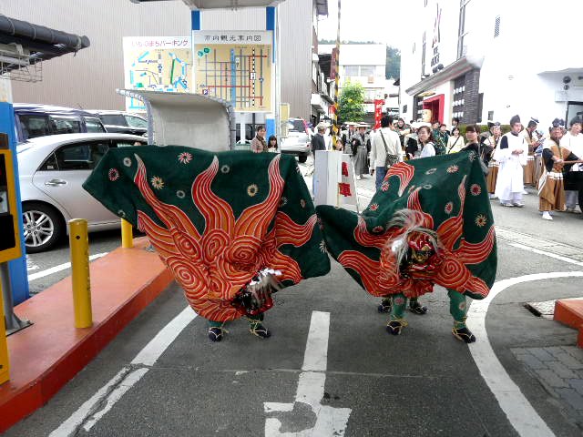 警固など総勢数百名の大行列がお囃子や雅楽などを披露しながら町を巡り、時代絵巻物さながらの行列でした。桜山八幡宮などでは朝から獅子舞の奉納などが行なわれた。