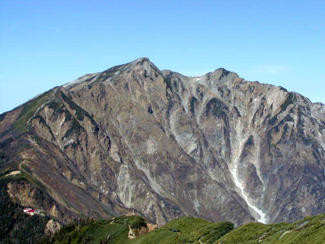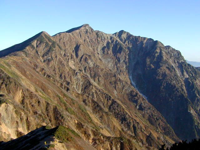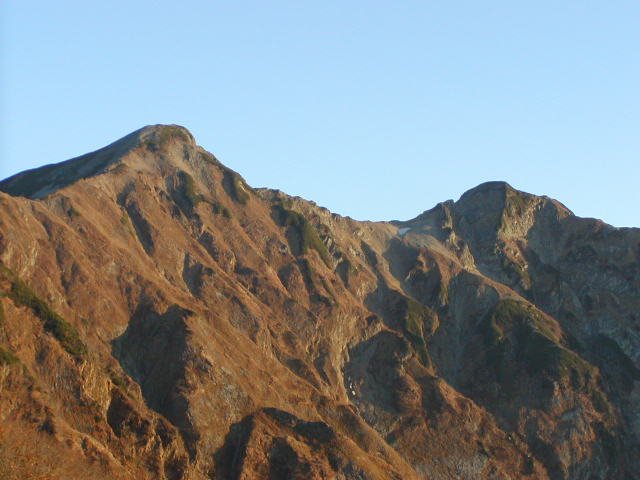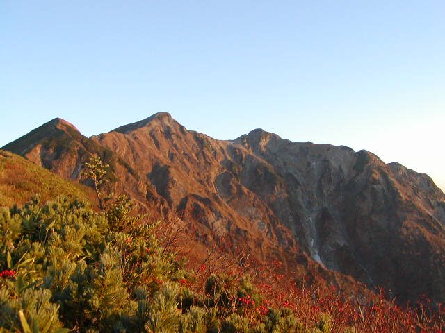 「鹿島槍ヶ岳」の「冷池山荘」(標高2420m)の西斜面は黒く見えていた。鹿島槍のテント場上からは赤く染まった「布引岳」(標高2683m)・「鹿島槍ヶ岳・南峰」(標高2889m)・吊り尾根・「北峰」(標高2842m)が美しい。