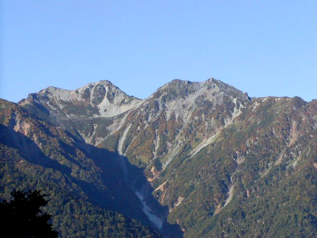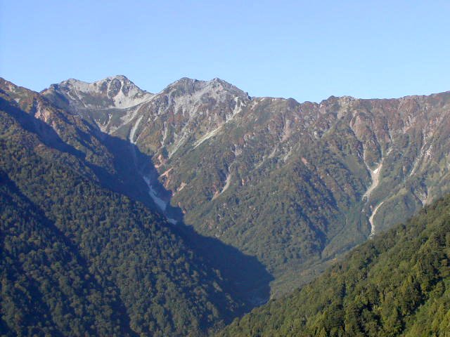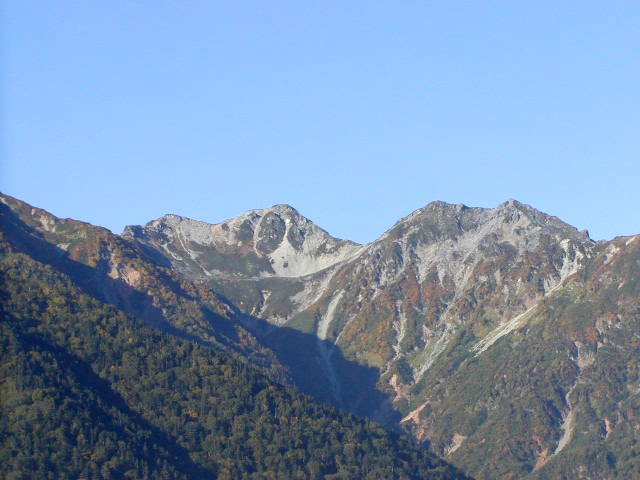「爺ヶ岳」〜「冷乗越」(標高2444m)の稜線は緑色に赤や黄が点在、「冷乗越」〜「冷池山荘」への樹林帯は針葉樹に混じってナナカマドがきれい。