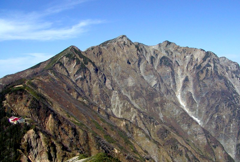 爺ヶ岳は3つのピークの北峰(2631m)・中峰(標高2670m)・南峰(標高2660m)、最高地点は中峰。このところの冷え込みで色づきは増してきた。ナナカマドの赤、ミネカエデのオレンジ、ダケカンバの黄色など。爺ヶ岳・南峰〜種池山荘の