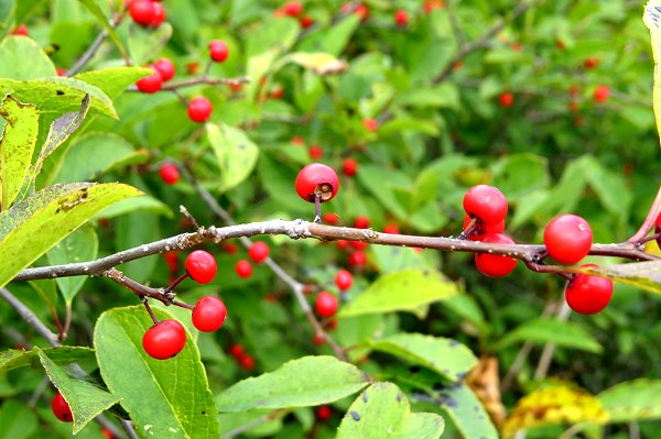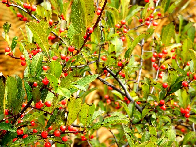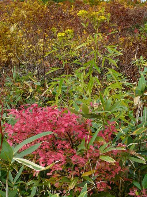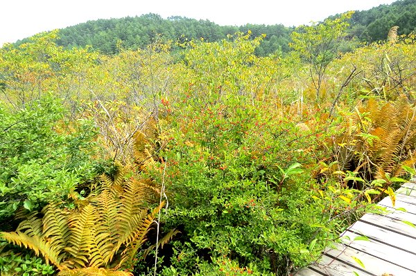 つけたミヤマウメモドキの木がたくさん見られた。実がつくのは雌のみで、雄も花が咲きますが実はなりません。晩秋にはさらに赤く光沢が出て、10/下-11/初になれば葉が落ちて、湿原は一面真っ赤になります。初冬には白い雪と赤い実との