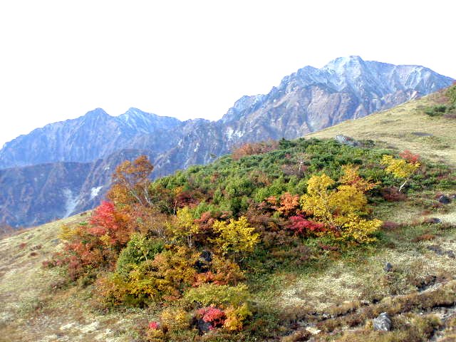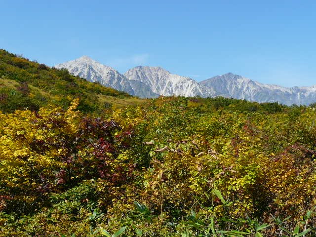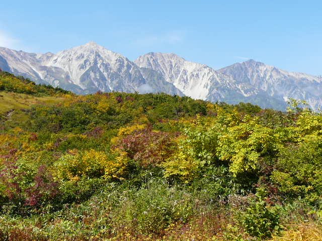大町「扇沢」(標高1350m)登山口から登り始め、標高2000m〜2400mの柏原新道の水平道〜稜線下の紅葉はよい色付きでした。まさにダケカンバの黄葉のトンネルのよう。所々にナナカマドの赤、ミネカエデの橙色がきれい。