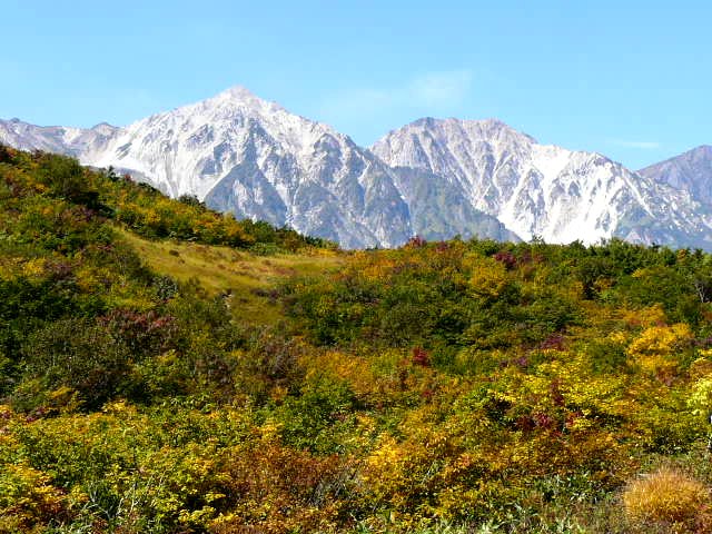 白馬乗鞍岳〜白馬三山と栂池自然園の紅葉が美しい。ヤセ尾根は色鮮やかでサラサドウダンが赤く色づく。(以下の写真は以前のものを含む)