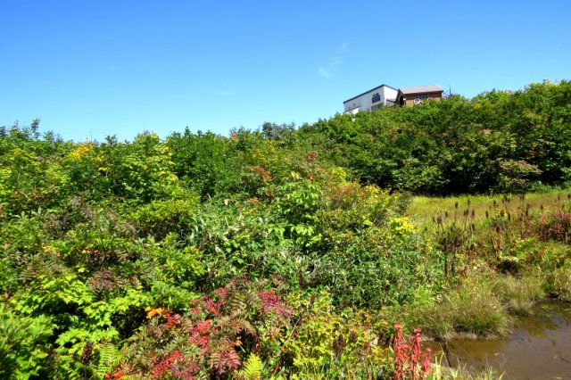 唐花見湿地にはミヤマウメモドキが一帯に群生。湿原には木道が整備され約30分で一周。この日は訪れる人もおらず、静寂に包まれた湿原。入口には「熊出没」の注意書きが立っています。熊鈴を携帯し周囲を注視しながら散策。赤い実を