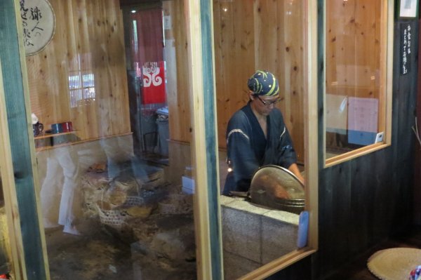 3)そば;小谷産のそば粉は石臼で自家製粉。細めのそばで薪を使ったかまどで茹でる。蕎麦を茹でるのは薪で焚く、自作の石釜戸というこだわり。釜場はガラスで仕切られているので作業を見られます。ざるそばは腰があります。「蛍の緑」は